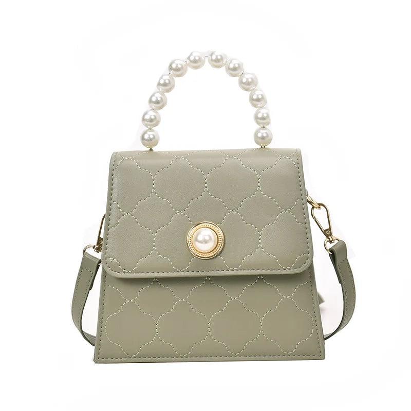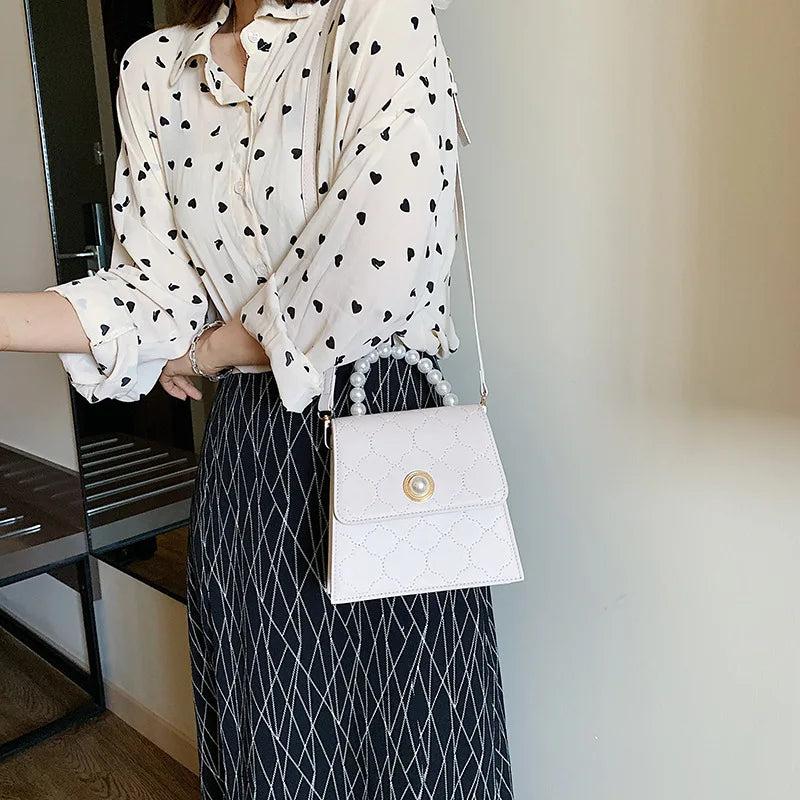This sweet crossbody bag features a solid clutch design with pearl decoration, perfect for parties and events. Made of high quality leather material, it is a stylish accessory for any outfit.