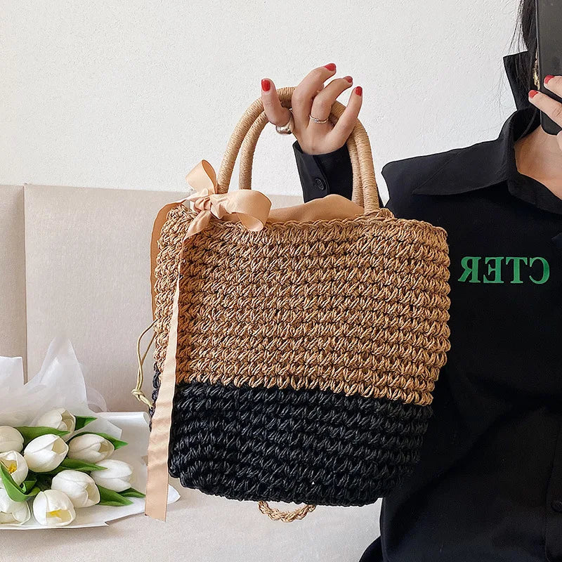 Straw Hollow Bucket Shoulder Bag Summer Beach Purse Vintage Handbags
