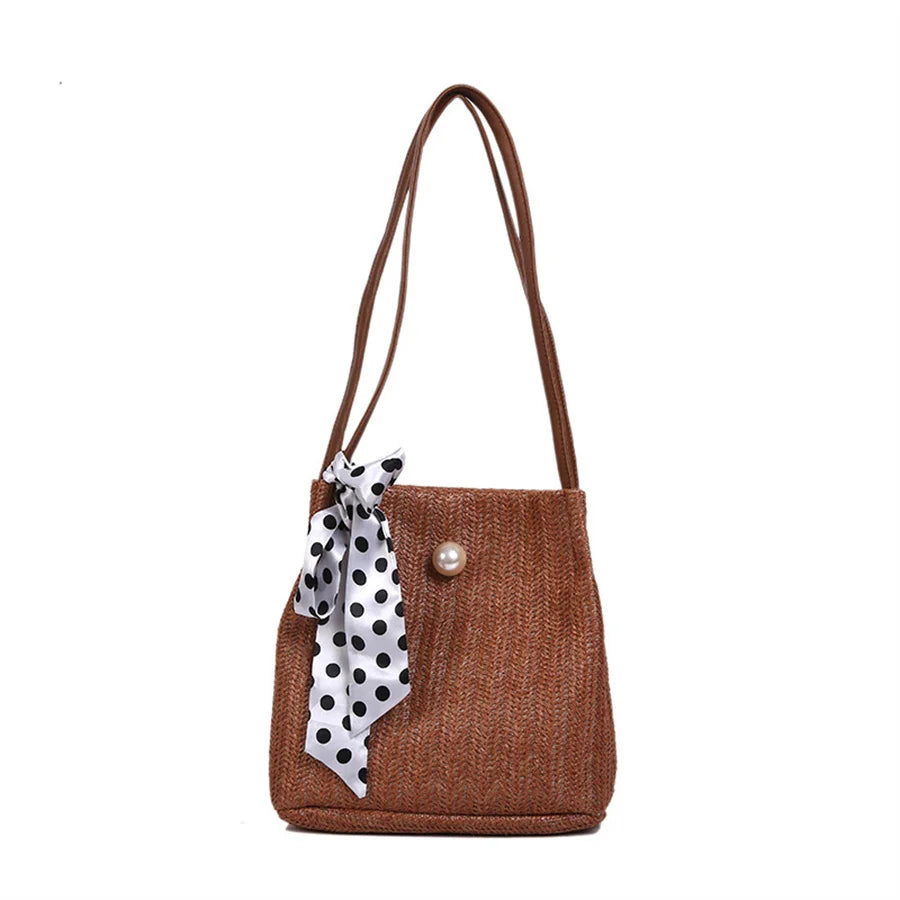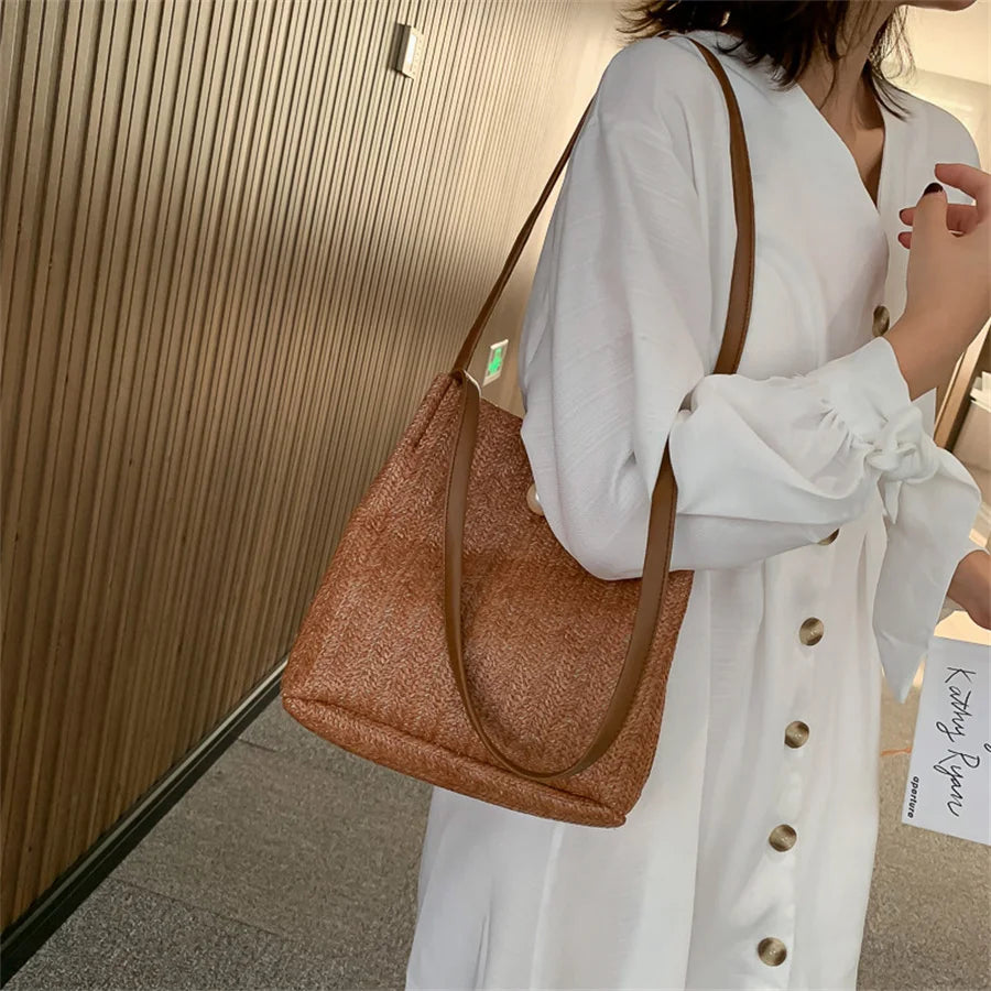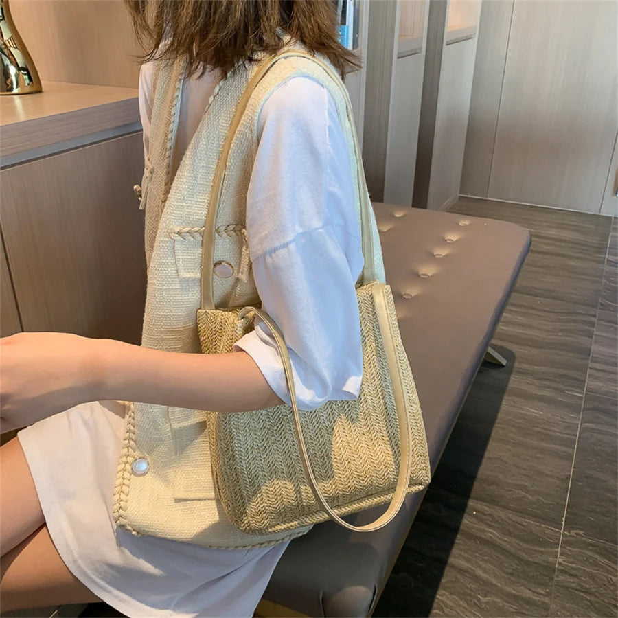This straw plaited shoulder bag is a stylish and practical accessory for women. It features a high capacity design, making it perfect for everyday use.
