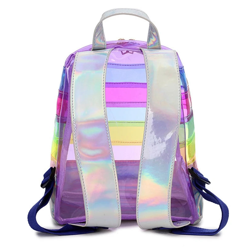 This colorful and stylish backpack features stripes design and is made of transparent plastic material. Perfect for school, travel, or everyday use.