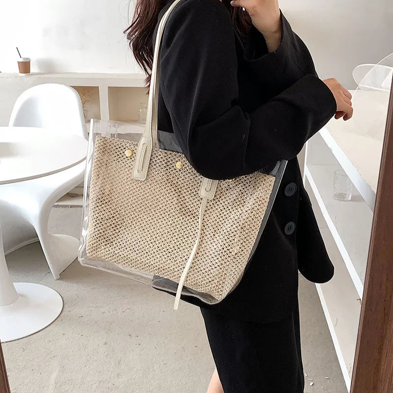 This stylish straw bag is perfect for summer outings. It features a transparent design and a woven shoulder strap for a trendy look. Ideal for the beach or casual outings.