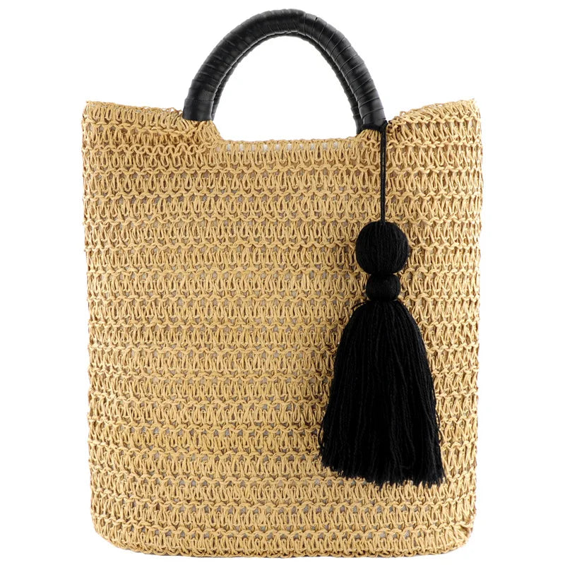 Stay stylish at the beach with this hand-woven straw bag featuring tassels. Perfect for carrying your essentials while adding a touch of boho charm to your outfit.