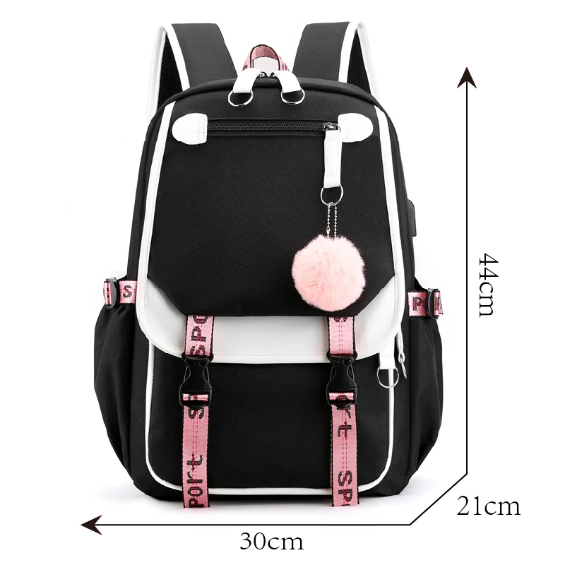 Teen Girls Pink Canvas School Bag USB Port Student Backpack