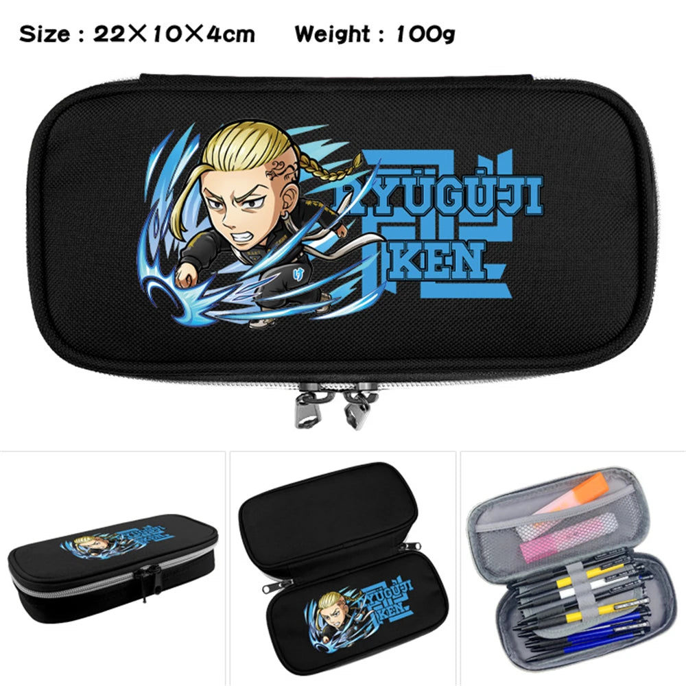 Keep your pens and cosmetics organized with this Tokyo Revengers pencil case featuring a cool cartoon design. The double zipper design adds convenience and style to your stationary storage.