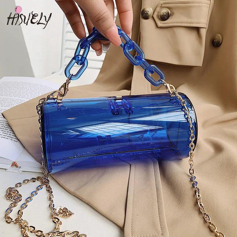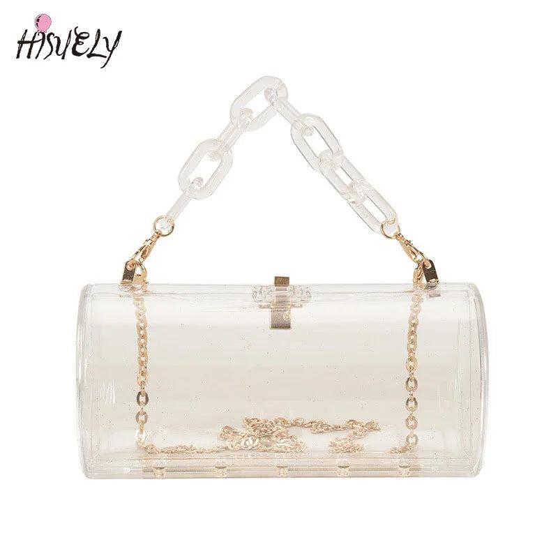 Stay trendy with this small acrylic cylinder box bag featuring a transparent design and chain strap. Perfect for a chic and modern look.