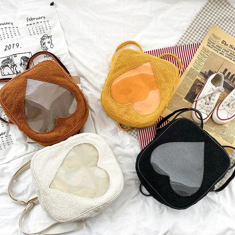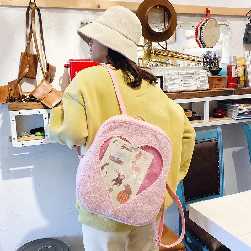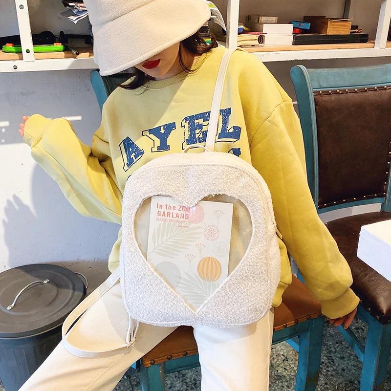 Carry your essentials in style with this trendy itabag backpack. Perfect for teen girls, this backpack features a transparent heart shape PVC design, ideal for showcasing your favorite pins and accessories.