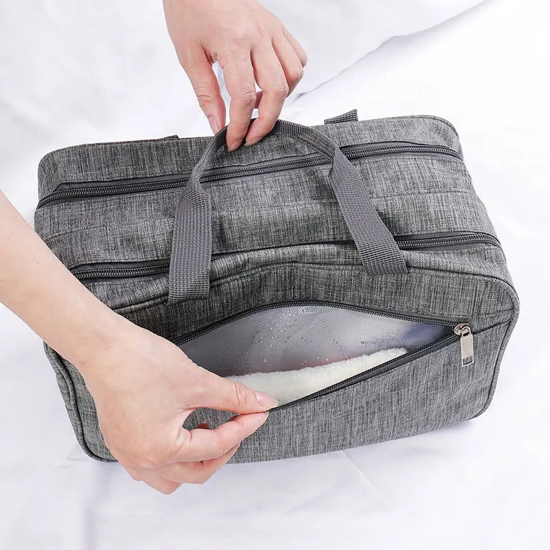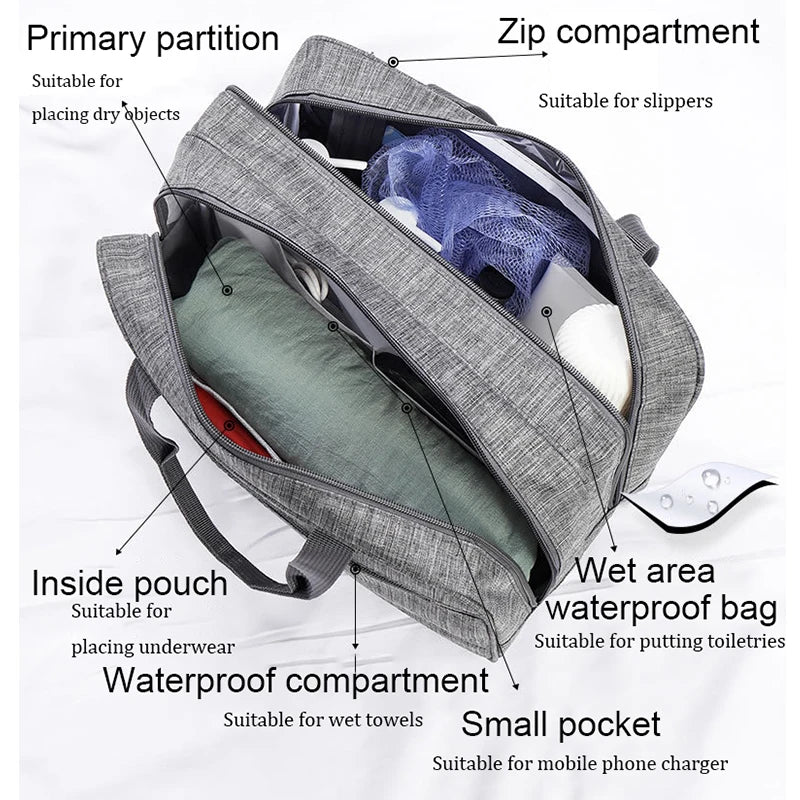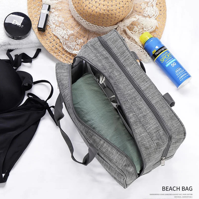 This multifunctional bag is perfect for organizing cosmetics, toiletries, and other essentials while traveling or at the beach. It features a large capacity with dry and wet separation compartments.