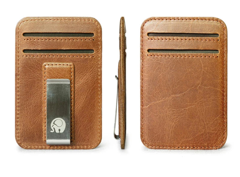 This slim wallet is crafted from high-quality crazy horse leather, making it a perfect gift. It features a front pocket money clip and mini clamp purse for easy organization.