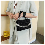 This small square bag is perfect for various occasions. It features a chain strap for crossbody or handheld use.