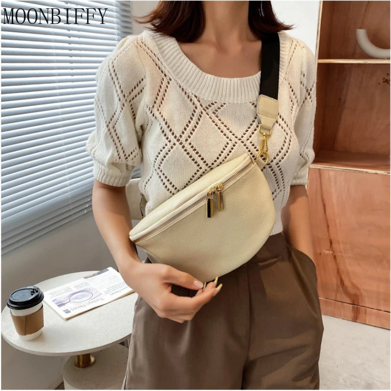 This stylish fanny pack is perfect for women on-the-go. It can be worn around the waist or as a crossbody chest bag with its wide shoulder strap.