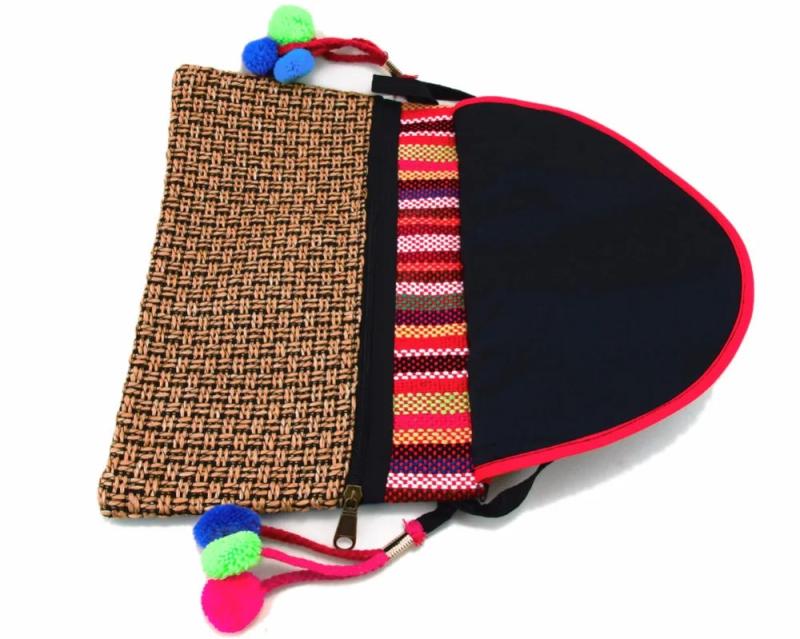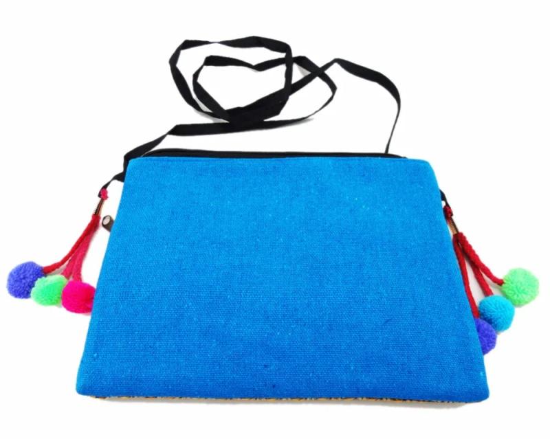 This unique shoulder bag is handcrafted with linen embroidery in a traditional Hmong tribal design. It features a tapestry pattern and a cute pom charm for added flair.