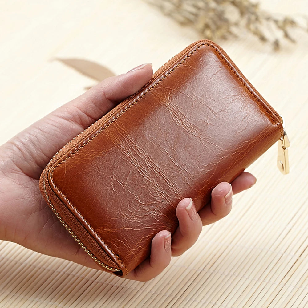 This smooth oil wax leather vintage clutch is designed to keep your keys, cards, and cash organized. It features a zipper closure for secure storage.