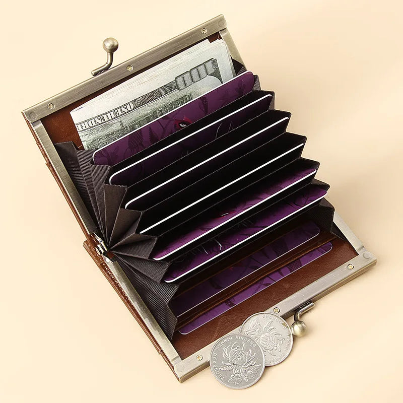 Stay organized with this vintage-inspired card bag made of high-quality oil wax leather. The bag features a clip buckle closure and multiple slots for your credit cards.