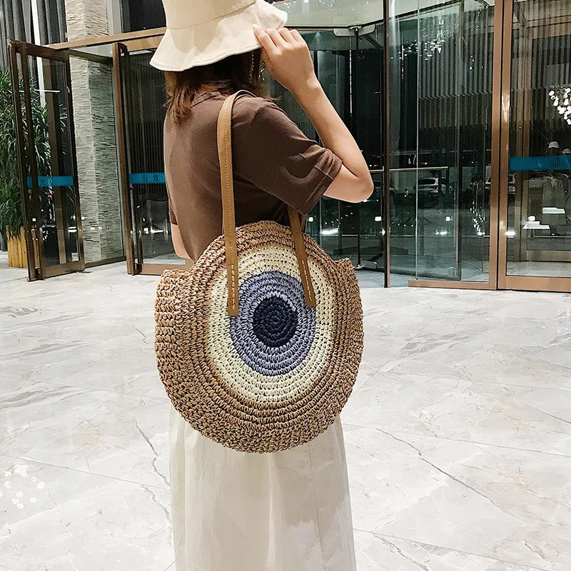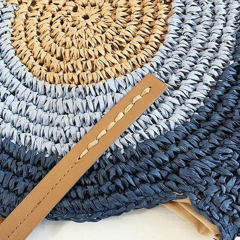 Vintage Round Straw Beach Bag Woven Raffia Shoulder Bag