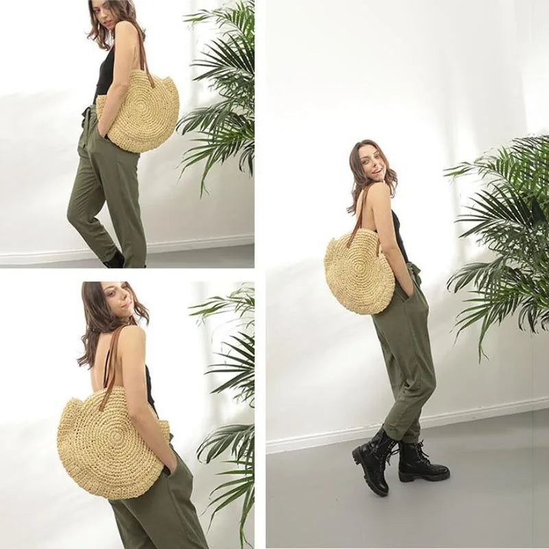 This round straw beach bag is perfect for your summer vacation. It features a vintage woven design and a shoulder strap for easy carrying. Add a touch of bohemian style to your outfit with this raffia circle bag.