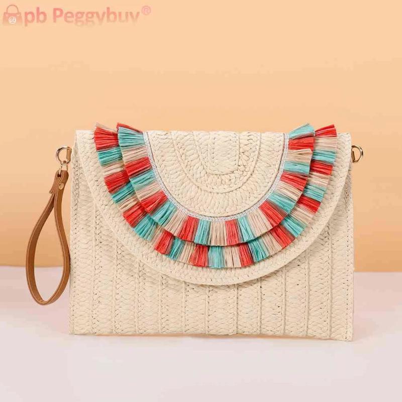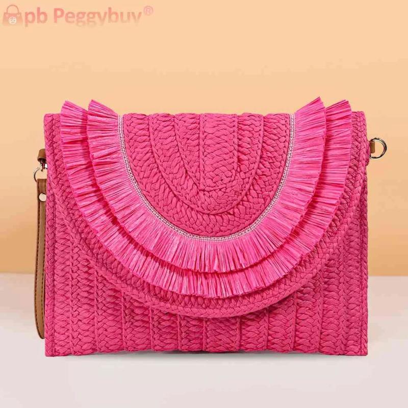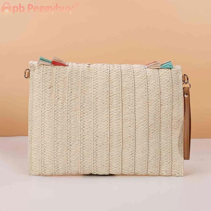 Elevate your weekend vacation look with this casual and portable crossbody bag made of straw woven material. Its soft texture and solid design make it a stylish accessory.