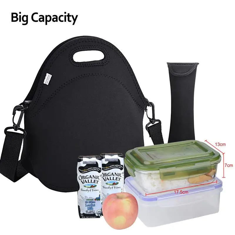 This neoprene lunch bag is designed to keep your food fresh and cool. It is waterproof and provides thermal insulation for your lunch. Perfect for school or work.