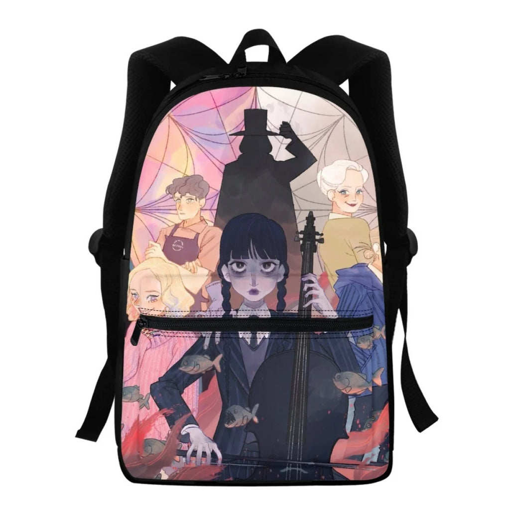 This backpack features a non-fading cartoon print of Wednesday Addams from the TV series. Perfect for students, it offers ample storage space and is ideal for sports or everyday use.