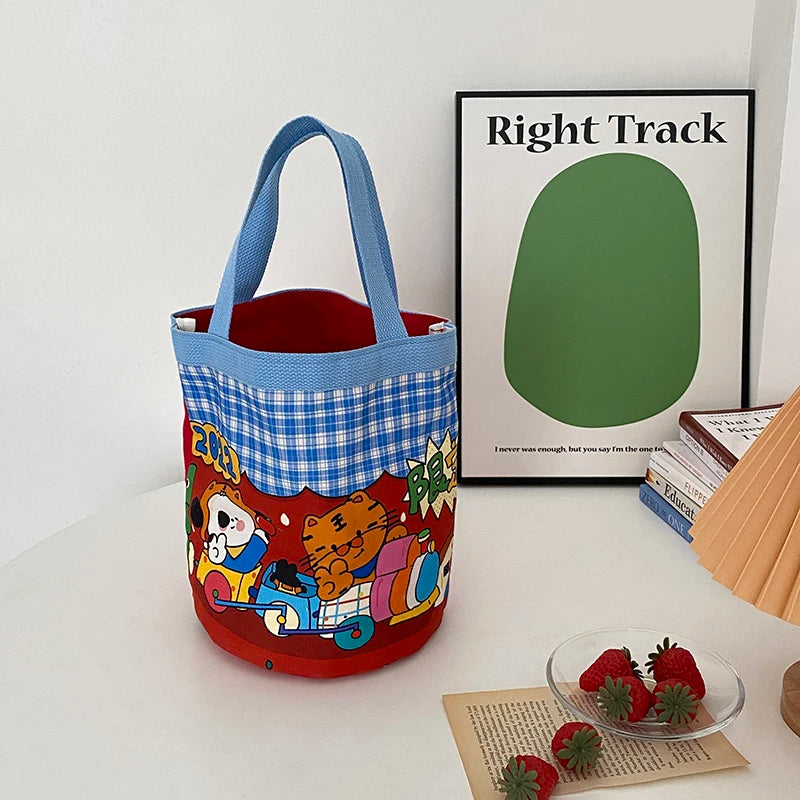 Woman's Cartoon Bucket Tote Bag Large Capacity Handbag Canvas Bento Bags