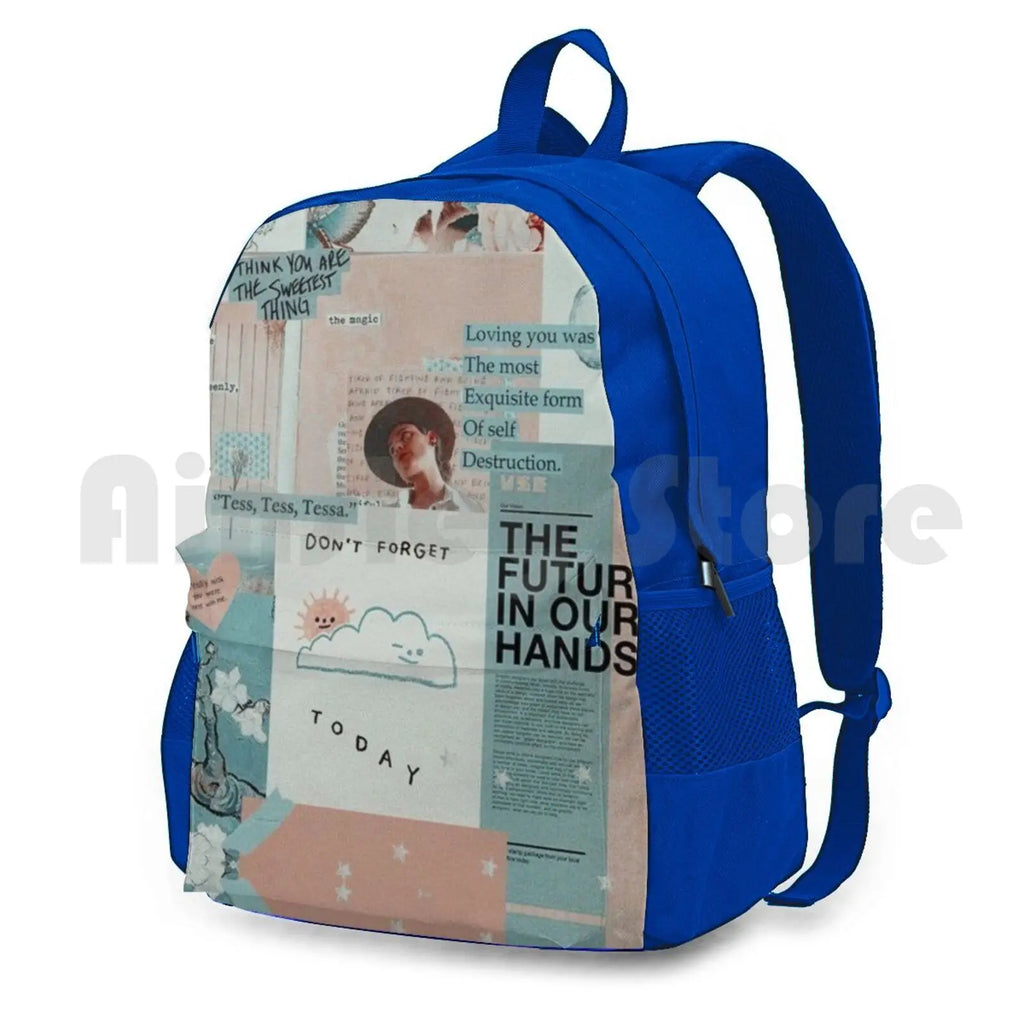 This Y2K collage backpack is perfect for outdoor adventures. It features a light pink design and is waterproof, making it ideal for camping and travel.