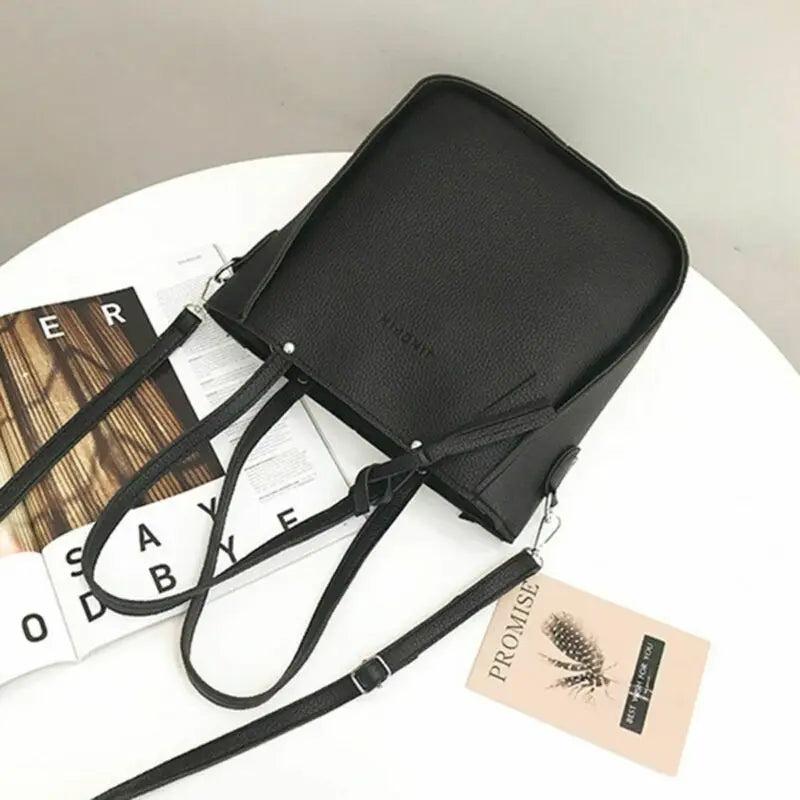 This 4-piece handbag set includes a shoulder bag, tote, messenger bag, and purse in high-quality PU leather material. Available in 9 stylish colors.