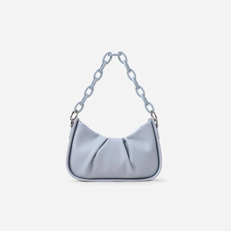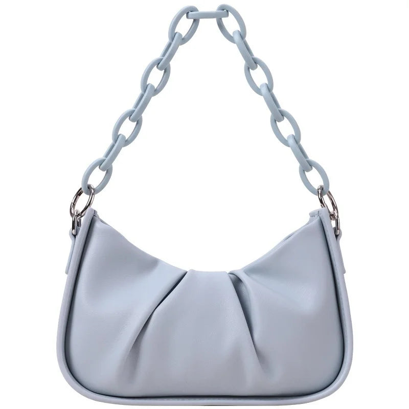 This stylish underarm bag is perfect for spring and summer. Made of high-quality acrylic material, it features a pleated design and a solid color. The chain strap adds a trendy touch to your outfit.