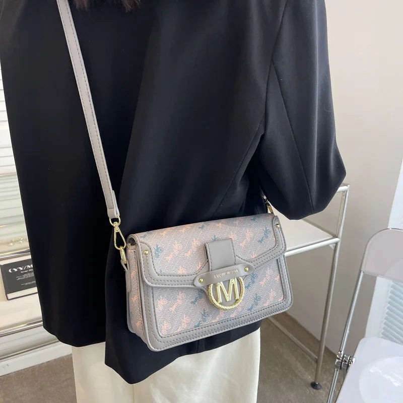 This stylish armpit bag features a trendy animal print design and a single shoulder strap. The letter M detail adds a fashionable touch.