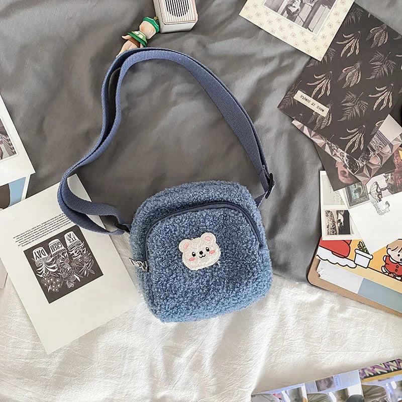 Stay trendy with this cute bear messenger bag, perfect for carrying your phone or essentials. Made of plush material, ideal for autumn and winter seasons.