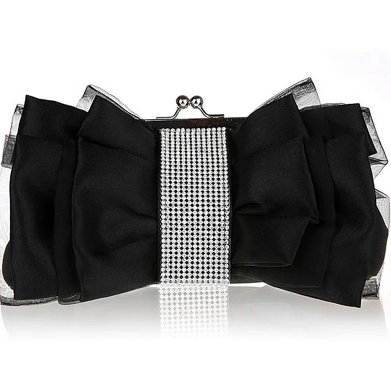 Add a touch of elegance to your outfit with this beautiful evening clutch bag featuring a bow shape design and rhinestone accents. Perfect for weddings, parties, and special occasions.