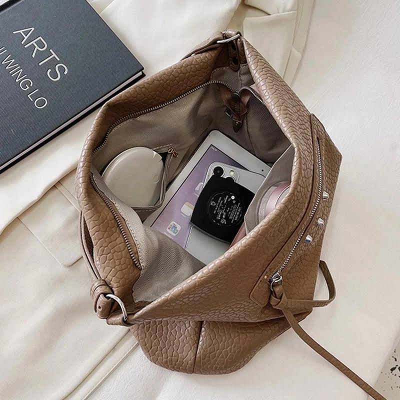 Brown Rivets Shoulder Bag Soft Leather Handbag Messenger Bag Crossbody Tote