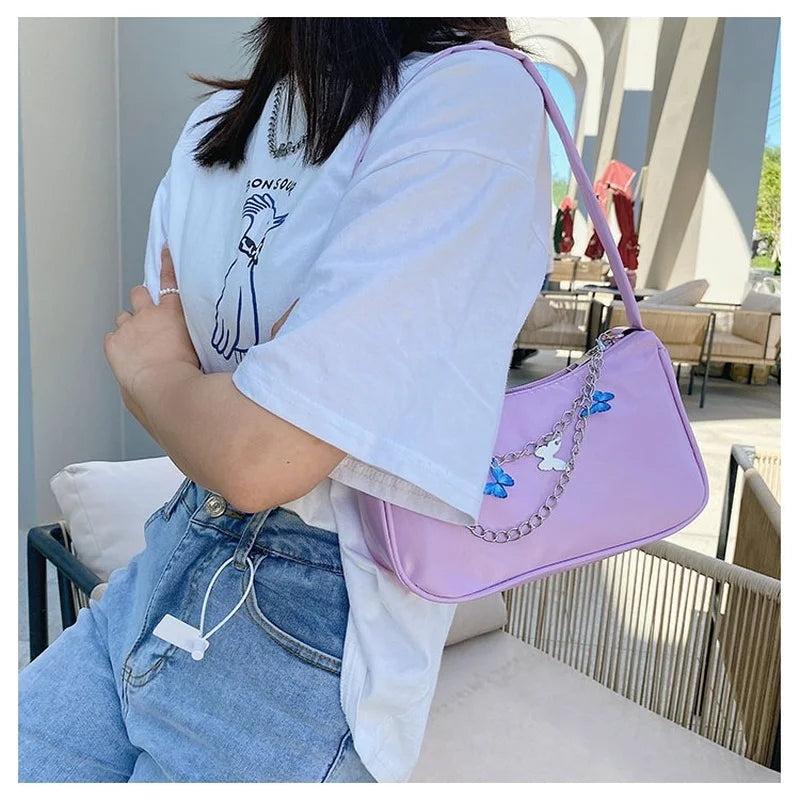 This stylish shoulder bag features a candy-colored butterfly design, perfect for adding a fun and playful touch to your outfit.