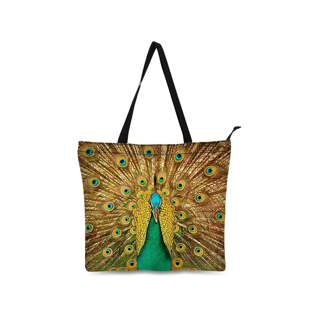 This high capacity canvas shopping bag features a stylish feather print design. It is perfect for women looking for a practical yet fashionable accessory.