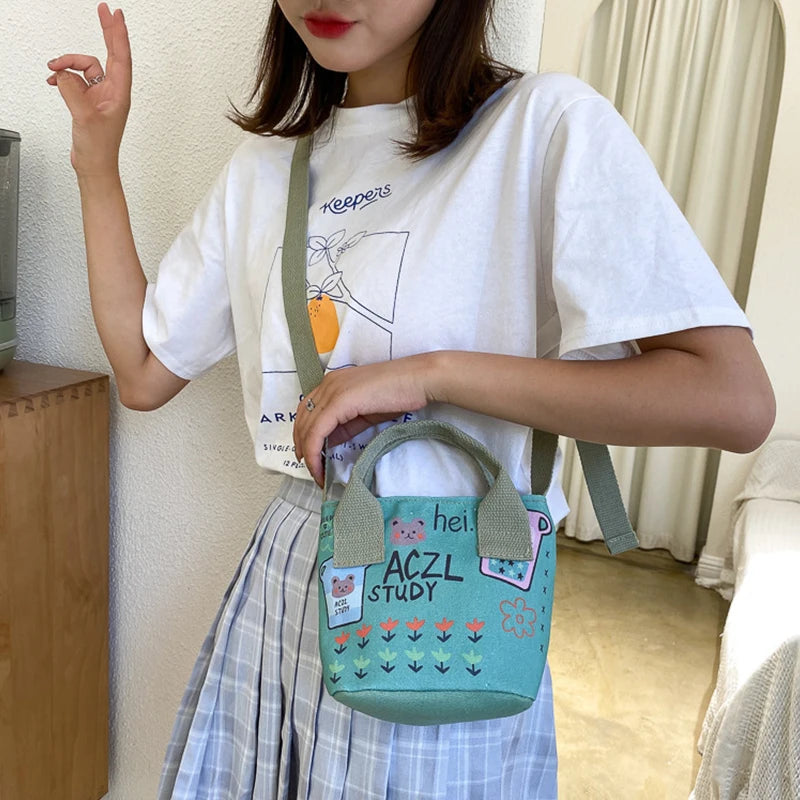 Canvas Bucket Bags for Women Student Shoulder Bags Cartoon Messenger Bags