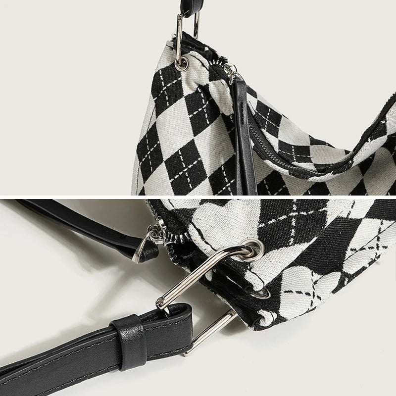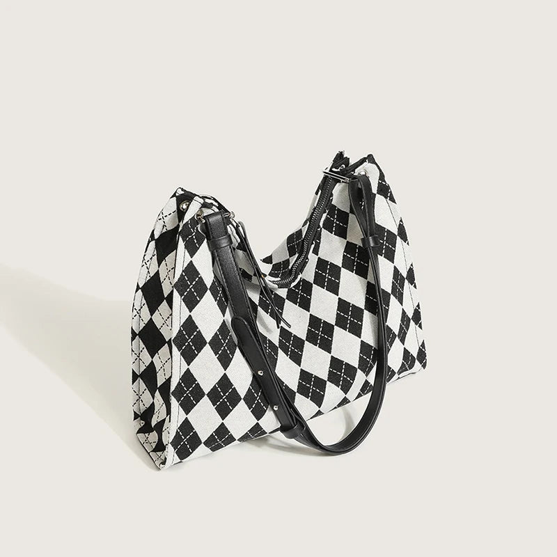 This canvas shoulder bag features a checkered pattern and contrast stitching, offering a stylish look. It has a large capacity with an adjustable strap and zipper closure for convenience.