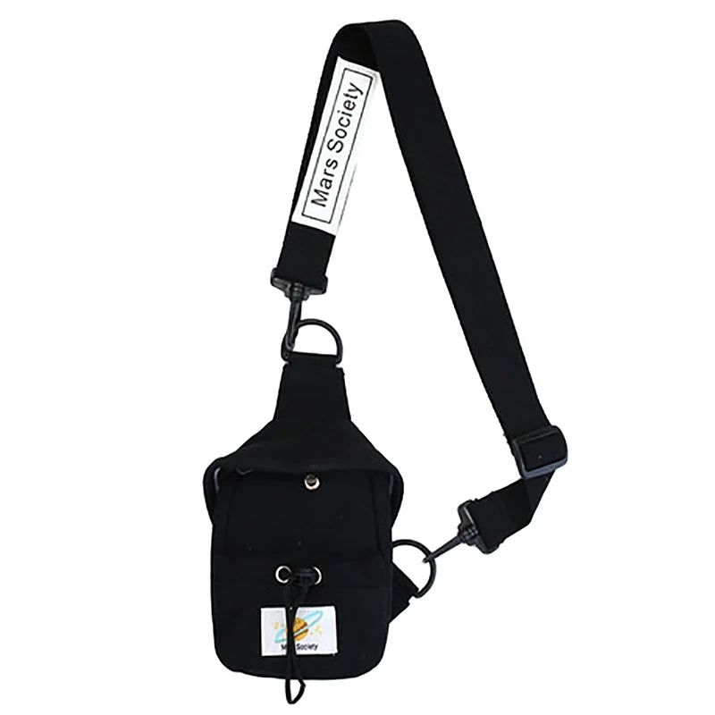 This small canvas chest pack is perfect for carrying your essentials on the go. It can be worn as a crossbody bag or hip hop streetwear fanny pack.