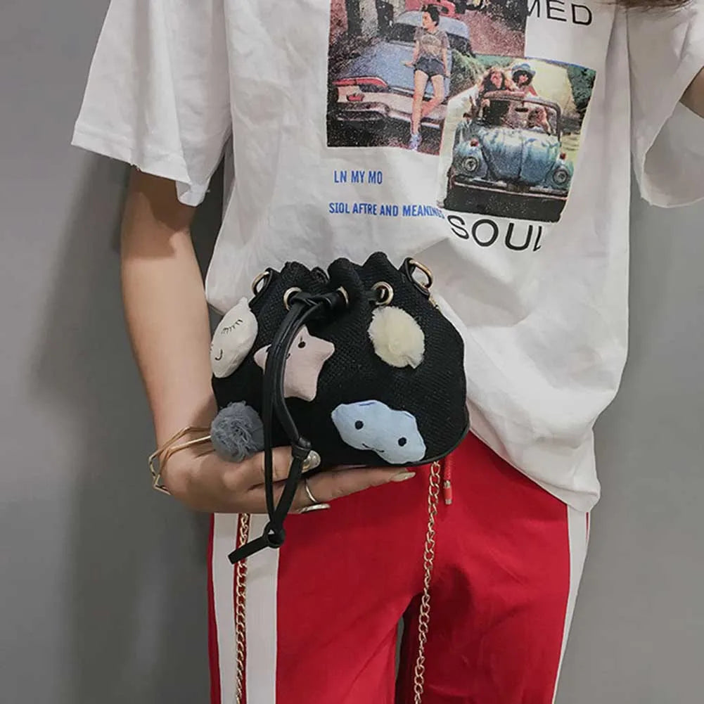 Canvas Drawstring Bucket Bag with Metal Chain for Women