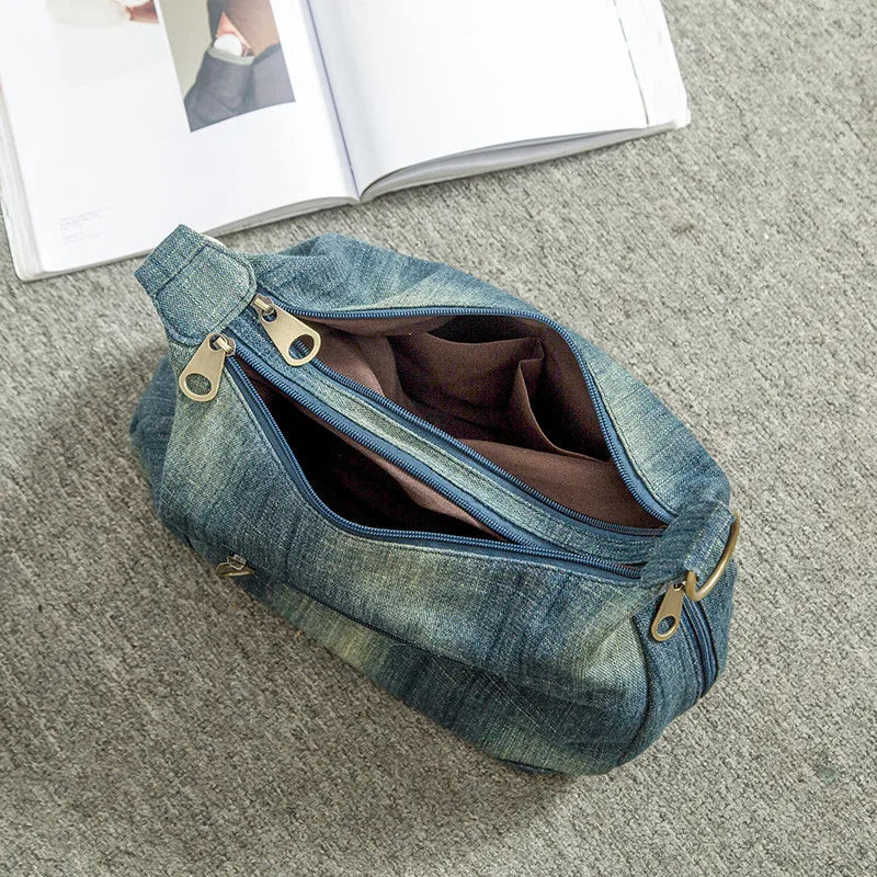 This casual denim crossbody bag is perfect for female travelers. It features double zippers for easy access and organization.