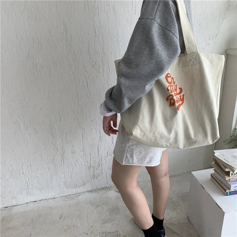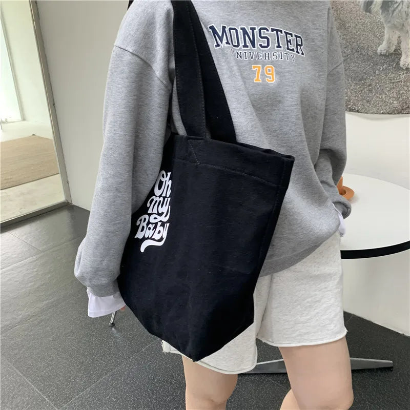 This stylish tote bag features a solid canvas material with letter printing, perfect for shopping or daily use. Its soft texture and reusable design make it a versatile and eco-friendly choice.