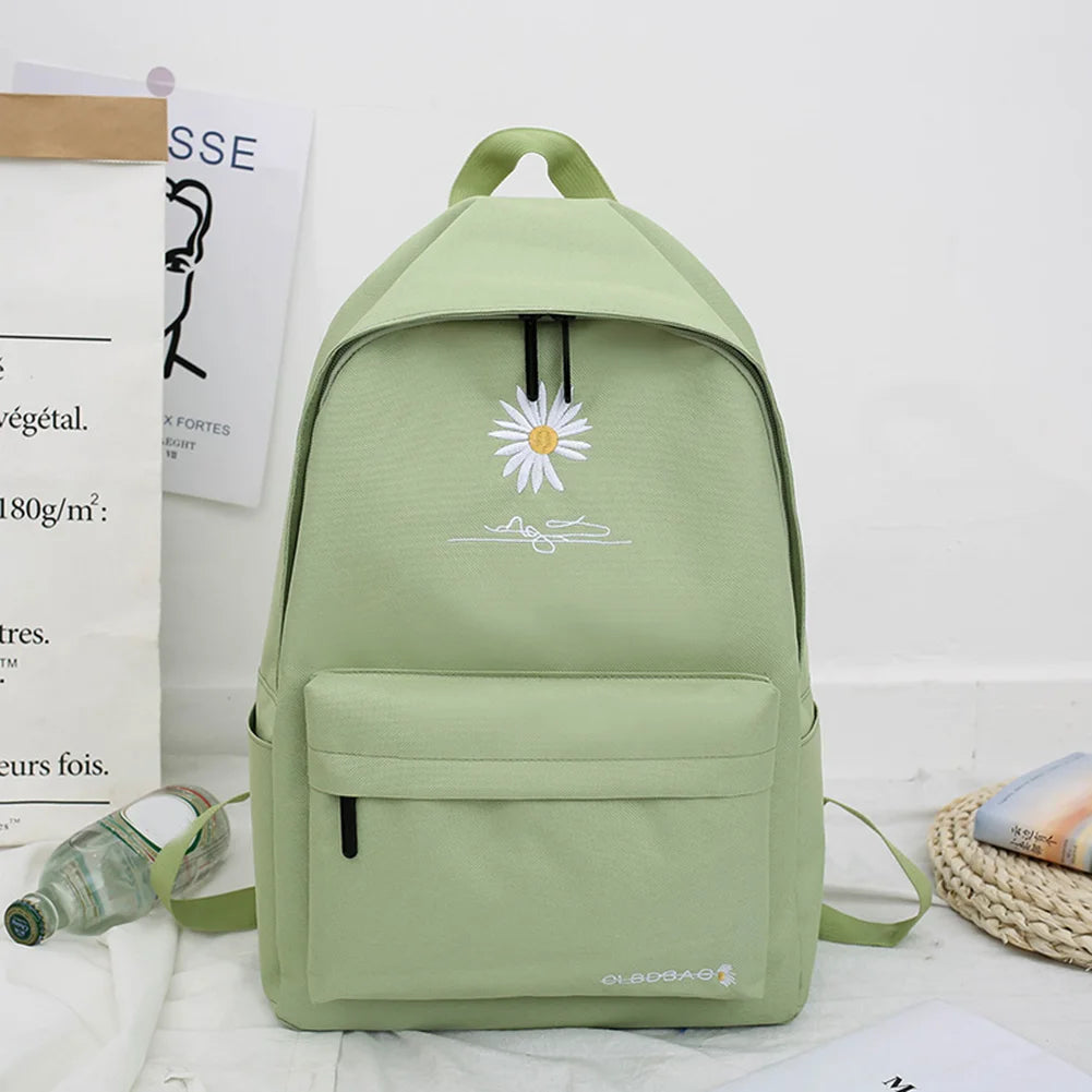 This casual canvas backpack is perfect for students and travelers. It features a stylish green color with daisy embroidery, offering a large capacity for all your essentials.