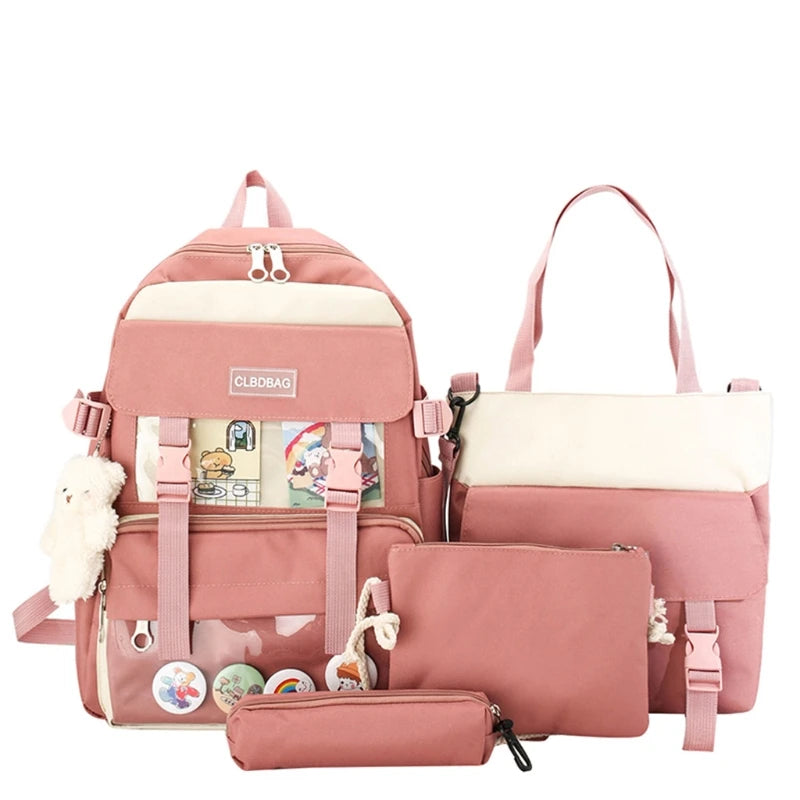 This 4-piece set includes a canvas school bag, suitable for teenagers, girls, students, and women. It features a portable book bag and pencil case, perfect for daily use and travel.