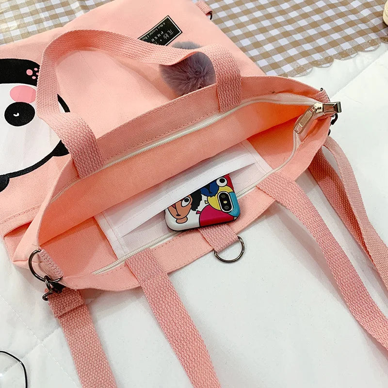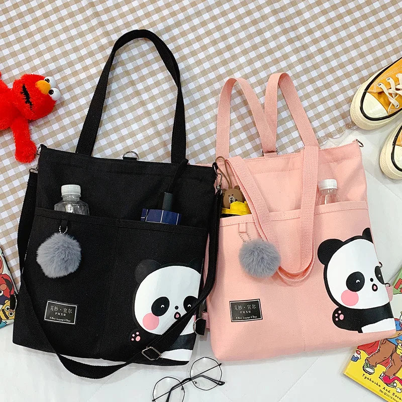 Canvas Shoulder Bag Cartoon Panda Print Shopper Purse Crossbody Bag