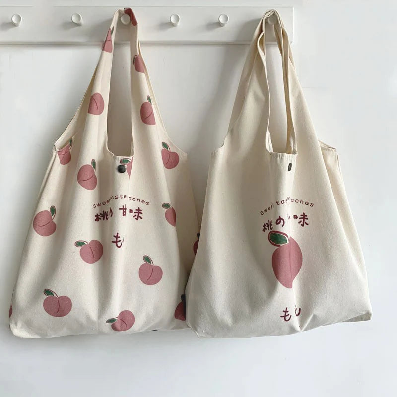 Stay trendy with this Japanese style canvas tote bag featuring a cute peach print. Perfect for running errands or shopping trips.