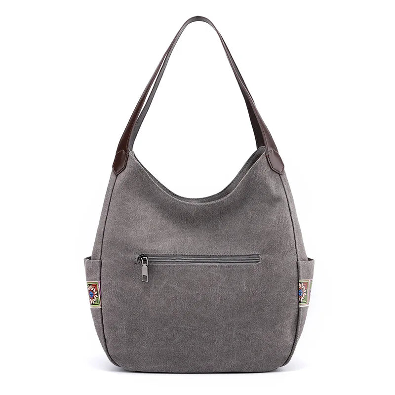 This large capacity canvas tote is perfect for women who love casual style. The embroidery adds a touch of elegance to the bag.