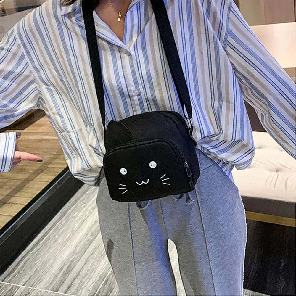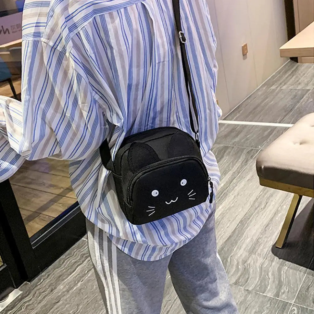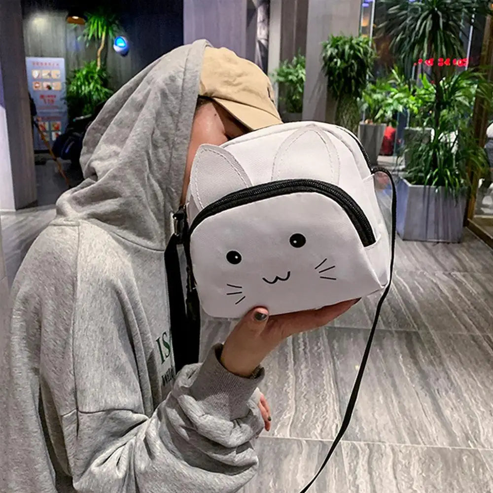 This adorable crossbody bag features a soft plush material with a cute cartoon cat design. Perfect for everyday use or as a fun accessory.
