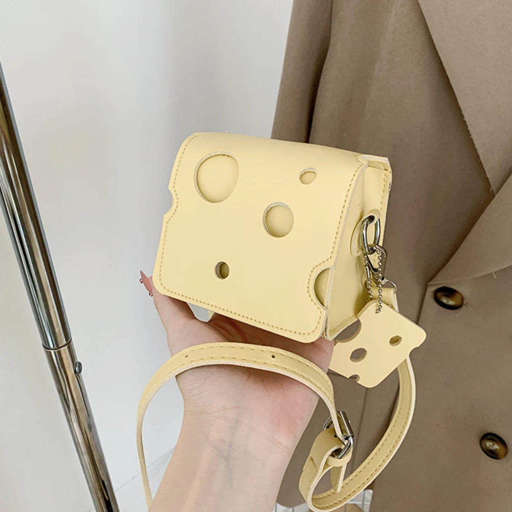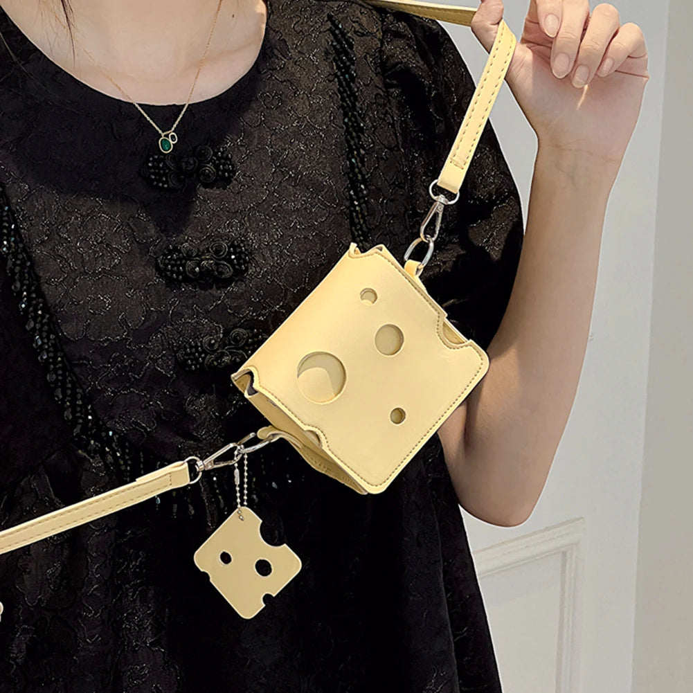 Adorable mini bag made of PU leather featuring a cartoon cheese design. Ideal for carrying essentials like money and small items.