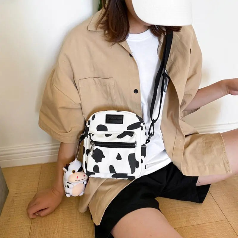 This shoulder crossbody bag features a cute cartoon cow print design, making it a fun and stylish accessory for women and girls. The bag is perfect for carrying your essentials while adding a touch of whimsy to your outfit.