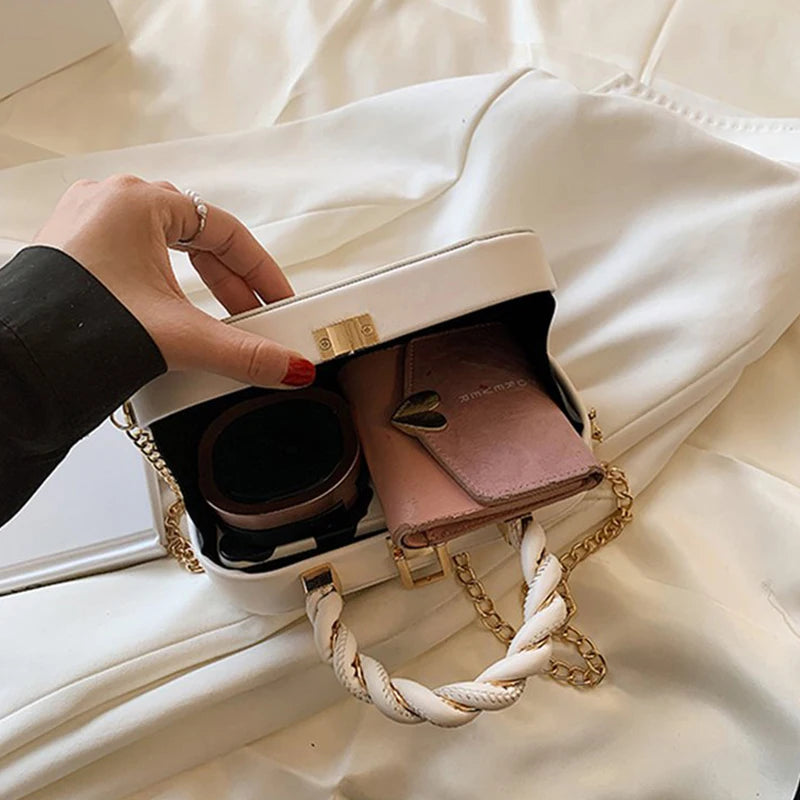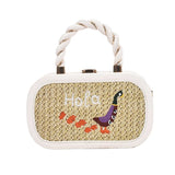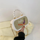 This stylish small square bag features a cute cartoon print and woven stitching. It has a chain shoulder strap for a trendy look.