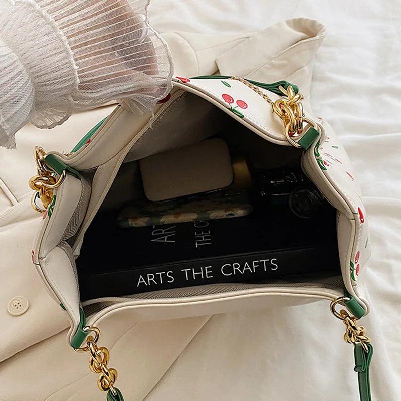 This stylish handbag features a printed PU leather design with a cherry pattern. It is a large capacity tote that is perfect for everyday use. The chain strap adds a touch of elegance to the overall look.