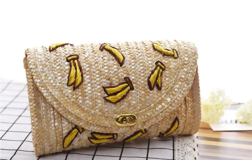 Stay stylish and organized with this cherry and banana embroidered straw beach bag. Perfect for summer outings, this flap messenger bag features a chain shoulder strap.
