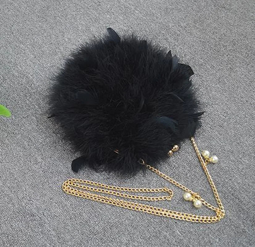 This feather handbag is a stylish addition to your evening party look. Perfect for carrying your essentials while adding a touch of glamour.